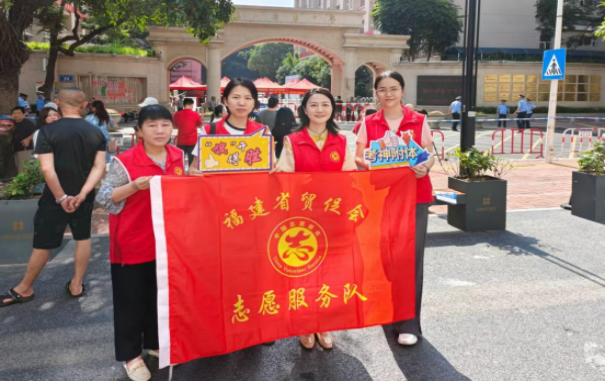 在树兜长者食堂·学堂服务台,省贸促会志愿者们贴心地准备了矿泉水、急救用品等避暑用品,帮助考生营造凉爽的候考环境。为给考生送上美好祝愿,现场还设置了“金榜题名”、“前程似锦”等祝福牌,热情邀请考生及家长合影留念,为紧张的考场氛围增添了一抹轻松与暖意。
