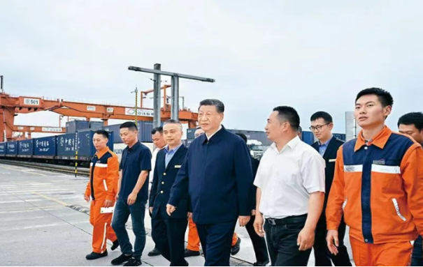 2024年4月22日至24日,中共中央总书记、国家主席、中央军委主席习近平在重庆考察。这是22日下午,习近平在重庆国际物流枢纽园区重庆铁路集装箱中心站,同货车司机、列车司机、装卸工人、场站管理人员等亲切交流。 新华社记者 岳月伟/摄