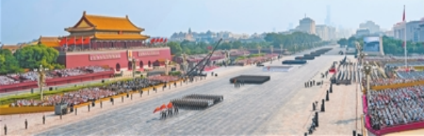 战旗猎猎,铁流滚滚。80面抗战英模部队荣誉旗帜组成的战旗方队,承载着历史荣光浩荡而来。这些英雄的旗帜、胜利的旗帜、不朽的旗帜,激励着人民军队勇往直前。装备方队编组陆上作战群、海上作战群、防空反导群、信息作战群、无人作战群、后装保障群、战略打击群隆隆驶来,接受检阅。新型坦克、无人智能、网电作战、高超声速、防空反导、战略导弹……从抗战时期土枪土炮到今天新型作战力量,国产现役主战装备和战略重器在天安门城楼前一一通过,展示坚决捍卫国家主权安全发展利益、坚定维护世界和平的钢铁意志和强大实力。