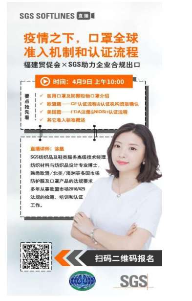 活动邀请SGS纺织品及鞋类服务高级技术经理、欧盟/北美多国市场防护服及口罩产品的法规及认证工作资深专家涂凰博士就防护物资出口欧美市场的法规及相关认证要求进行在线授课,比较分析了欧盟CE、美国FDA进口标准以及其他国家进口注册、认证标准及程序,具体讲解了口罩出口指南。在培训结束后的互动交流环节,专家对企业20多个在线提问进行了专业的解答与辅导,助力防护口罩企业快速合规进入欧美市场,有效解决防疫物资的燃眉之急。