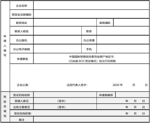 2.开通、使用申办原产地证书自主打印便捷快速通道。有条件的企业尽可能实行自主打印,实现申办原产地证书“不见面办公”。自主打印可以最大限度避免人员外出,减少接触,是对疫情防控工作的有力支持与配合。为了更好推广贸促会电子原产地证书自主打印,贸促会已对原产地证书的格式和签发形式进行调整,目前除哥斯达尼加优惠证外,其他所有证书均可实现自主打印。 疫情防控期间,为方便企业申办原产地证,贸促会优化自主打印功能申请流程,简化申报表格(见附件),企业只需填写后扫描上传,即时开通。申请开通自主打印功能后,企业只要配置一台任一型号的激光彩色打印机,即可实现申办原产地证书“足不出户、即打即用”。