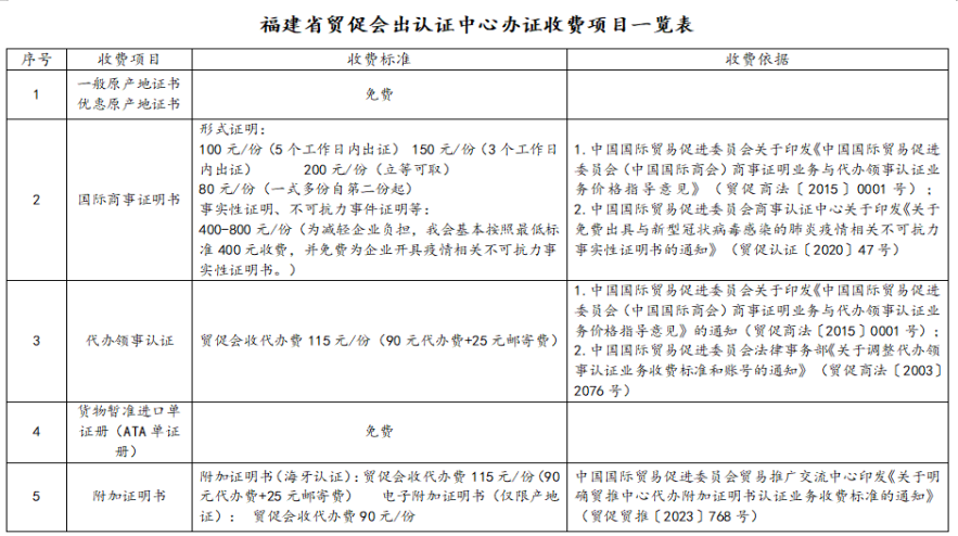 福建省贸促会出认证中心办证收费项目一览表