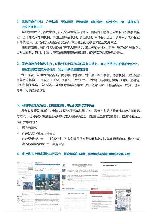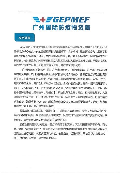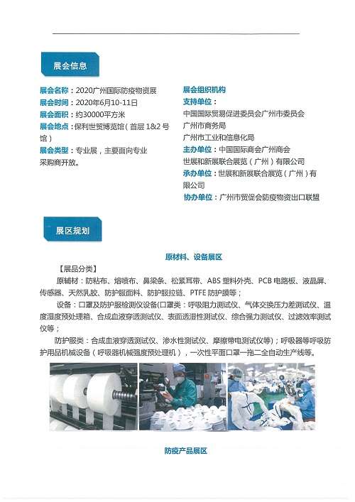 为贯彻落实习近平总书记关于夺取疫情防控和经济社会发展“双胜利”的重要指示精神,根据市委、市政府关于做好“六稳”“六保”的工作要求,由广州市贸促会、广州市商务局、广州市工业和信息化局支持,广州国际商会、世展和新展联合展览(广州)有限广发平台共同主办的“2020年广州国际防疫物资展览会”定于2020年6月10-11日在广州琶洲保利世贸博览馆举办。