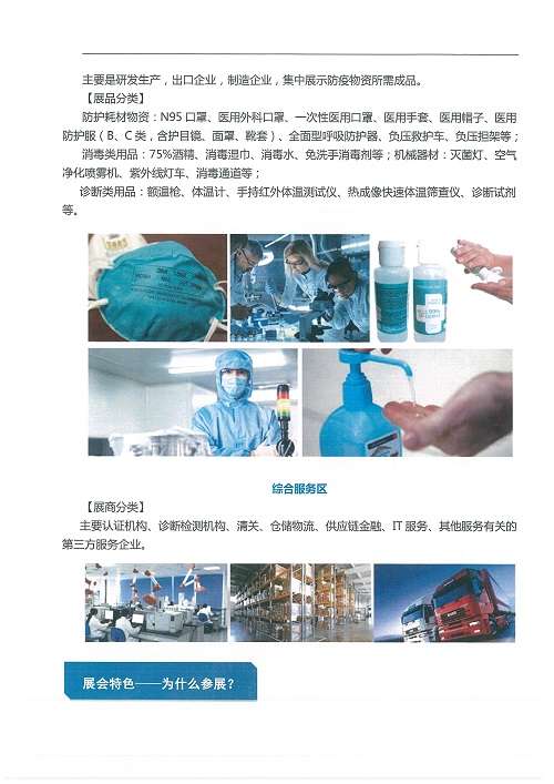 展会展览面积达33,000平方米,将开设设备展区、防疫产品展区、原材料展区和综合服务区四大主题展区,提供安全、合规的防疫全产业链产品及最新技术展示,同期配套防疫物资出口相关的政策宣讲、网红带货、直播对接等线上线下相结合的活动。展会参展企业均经过严格遴选,包括原材料、生产机器、产品辅料配件、产品成品以及第三方服务企业等,展品种类和服务一应俱全,品质优良,是我国防疫物资产品的首次专业、可信、高端展会。